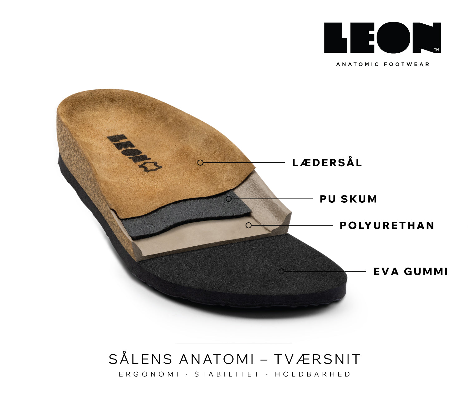 LEONs anatomiske fodseng er udviklet til at følge fodens naturlige form og give optimal komfort i hverdagen. Den formede svangstøtte, stabile hælkop og rummelige tådel sikrer god støtte og en behagelig pasform.